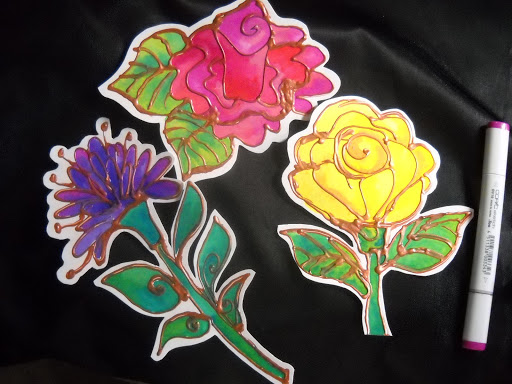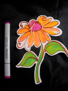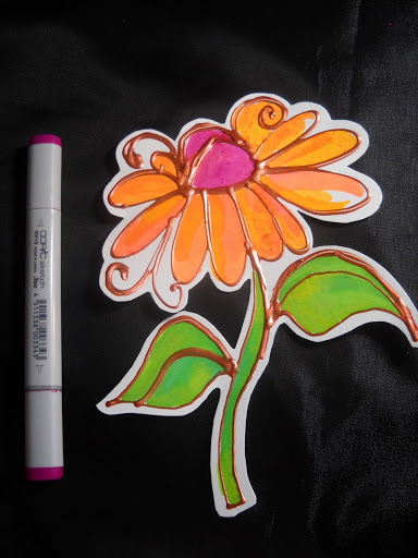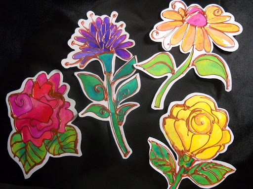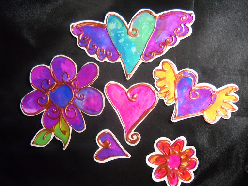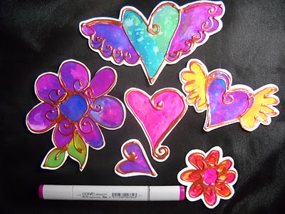 On white heavy cardstock, i drew a simple pencil sketch outlining some flowers, hearts and stars. With the nice thin point on the bottle of Pearls, i traced the outlines and let them dry overnite. Even though it was killing me to be patient, you probably could use your heat gun to dry. Then, my favorite part, the coloring!!!!!! Love love love me some coloring!!