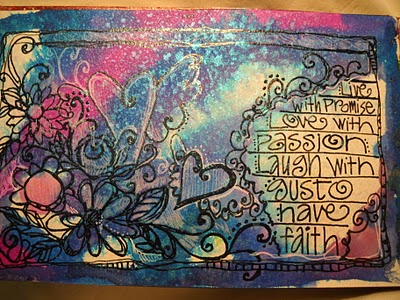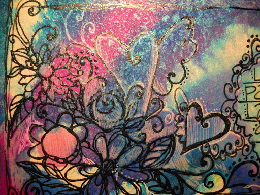 Crazy for the sparkly and shiny, when my Ranger Pearls Mists arrived, i just HAD to try the turquoise over the entire page! Really GOOD stuff, a very richly pigmented reflective shine. Just the way i like it.