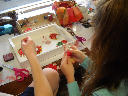 Like everyone else the “busy” is really kicking in! Over the weekend, i had my “Santa’s Secret Workshop” kids art classes at my studio . How precious these little darlings were, busy as little elves making all kinds of SECRET treasures for their families. I took some Ranger/Tim Holtz ideas and adapted them for the kids. Here are photos of the beautiful alcohol ink ornaments and a tattered fabric pin using Tim’s “Tattered Florals” die from Sizzix .