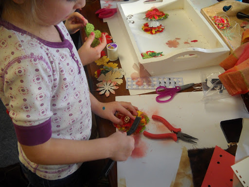 Making “Tattered Flowers” pins. Sewing them together and fraying the edges with a wire brush.