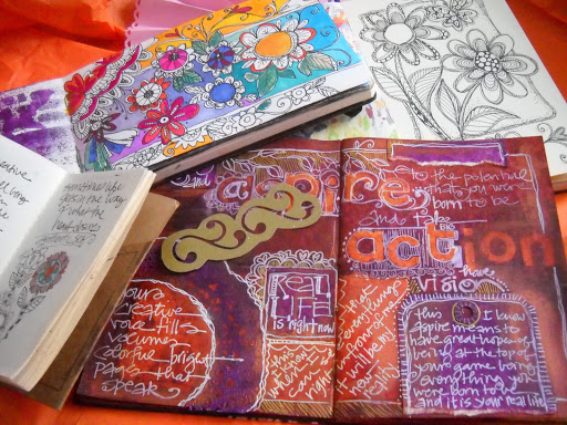 …so little time, especially this time of year!  Believe it or not, this is a helpful holiday topic, journals, journals, journals!  I LOVE MY JOURNALS, all of them! This pile represents the many directions my creative curiosities take me.  I draw, doodle, write, paint, mist, layer, color, and more.  It’s a mood thing.  Sometimes you’re in the mood to do one artsy thing, or another artsy thing.  Don’t be afraid to explore, “be all over the place” with your experiments and techniques.  It will help you find your creative passion, some things will feel more natural and gratifying, and others will leave you frustrated.