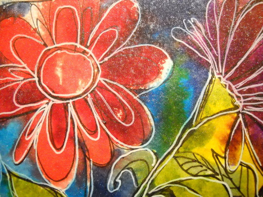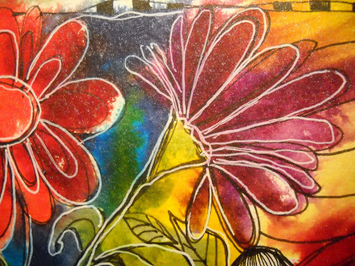 On the left page spread in my Moleskine Watercolor Journal, I drew my usual whimsical flowers then painted them with my Tim Holtz Distress Ink Reinkers. Just used drops of the distress inks in a paint tray, added water and painted with a brush. These colors are so bold and rich, just how i love them! (here i used Wild Honey, Rusty Hinge, Fired Brick, Orange Marmalade, Broken China, Scattered Straw, etc) Then, the “sugar on top” is some spritzing with my Ranger Perfect Pearls Mists in “Perfect Copper”. Just the perfect amount of shimmer to catch the light.