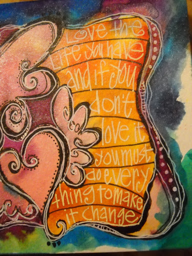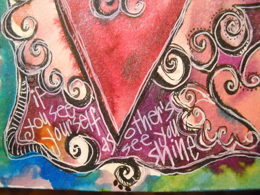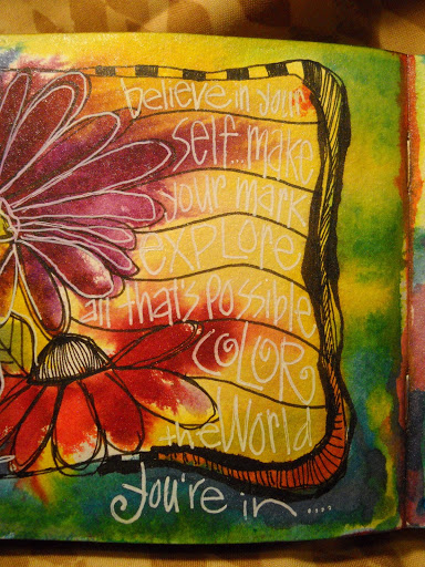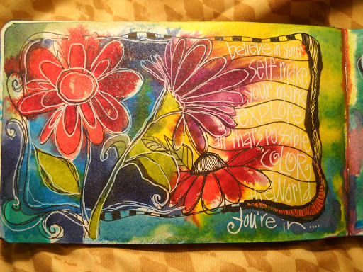 I get the most satisfaction from the creative process in my journals, exploring with paint, ink, spray, color, drawing etc. Colorful pages stay blank from the journaling part, waiting for writings to be inserted later. Here are two pages that have been awaiting their ‘written wisdom’ for months……….i finished them yesterday when i was supposed to be cleaning!