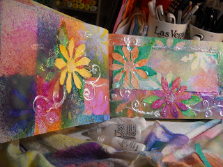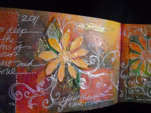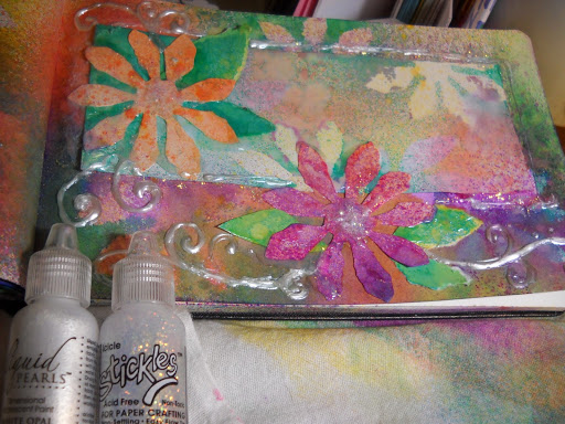 These pages were all “Ranger Driven”, using Color Wash, Distress Inks, way too many Stickles and lines of Liquid Pearls with gobs of Glossy Accents. I have piles of flower scraps from Tim Holtz Tattered Florals die, and i seem to love them in a lot of my projects!