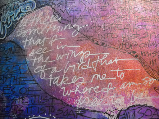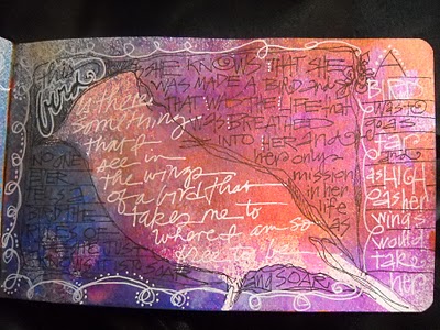 I’m really loving the bird silouette lately.  Journaling takes you to so many places in your head and your heart.  I don’t even know where the thoughts come from or how they get into my head as i am creating and start writing the entry.  The inks and pens and words take you away, very therapeutic.  Perhaps that’s why we find it so appealing, that we can be in  a comforting place right through our artwork.