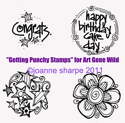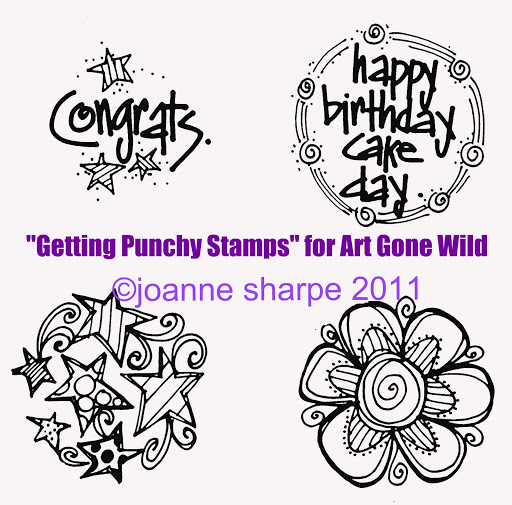 Time for some peeks!  I am so excited for Winter CHA and  new stamps i have coming out with Art Gone Wild (AGW).  This week i am finishing piles of cards for their booth display.  I have 12 collections with a total of 36 pieces of red rubber and clear.    Here is the first image in black and white.  These are called “Getting Punchy Stamps”,  sold in a set of 4, made to fit in a 3″ circle punch. (Marvy= purple punch).  Here are some fun sentiments and coloring images to make a quick and cute card: