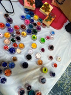 So many skill levels and these handmade journal embellishments were spectacular!  Made with Ranger Glossy Accents, Sakura Koi Watercolors and Twinks……..Thank you Sakura for your colorful contributions to our workshops!