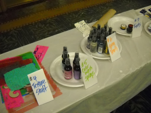 Bright bold colors created with Ranger Color wash, colorful acrylic dabbers and perfect pearls mists.  Thank you Tim Holtz and Ranger for supporting our class with your wonderful products to giveaway!  Everyone went home with bags of goodies from my product sponsors.