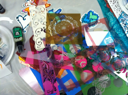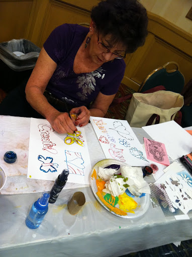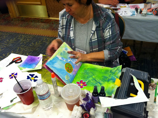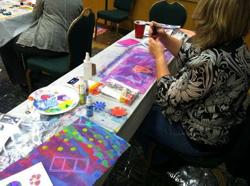 Sonia, the marketing director from Luminarte/Creative Imaginations even colorized her phone with painted bubble wrap!  We were so lucky to have her in class, as she treated us to using a whole table full of Twinkling H2Os, or “Twinks” as we affectionately call them.  Thank you Luminarte for your twinkling sparkling offerings on our buffet and the products in the students goodie bags!