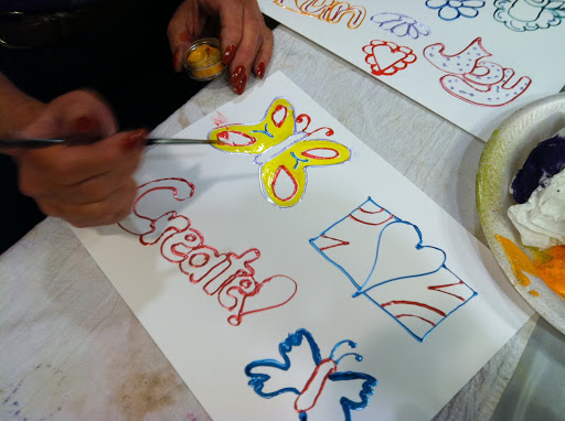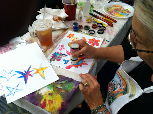 So many skill levels and these handmade journal embellishments were spectacular!  Made with Ranger Glossy Accents, Sakura Koi Watercolors and Twinks……..Thank you Sakura for your colorful contributions to our workshops!