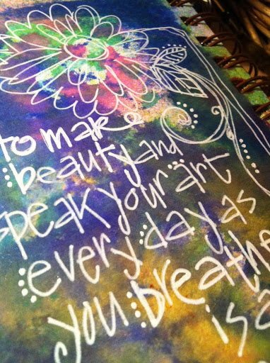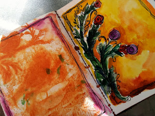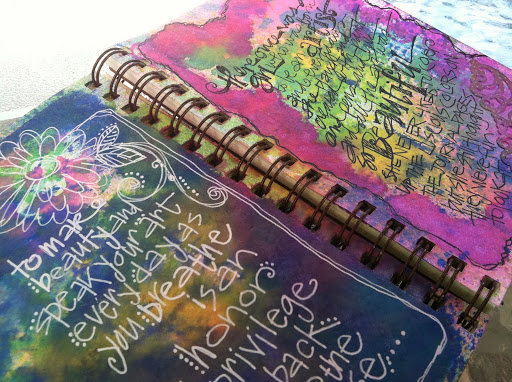 There are a zillion pens and paints to use, along with inks, sprays, mists, crayons, pencils, pastels, etc. Art journaling enables me to become a different artist in very book on every page. If i do a whole series in a book, i can keep it forever.