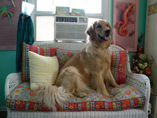 …when in actuality, the real studio always entertains a pet of some kind.   Teddie, My one year old golden retriever, is very comfy on my wicker couch!