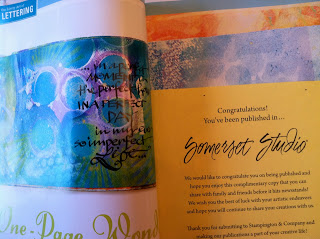 First, here’s my Somerset Studio piece “One Page Wonder” in the “Lively Art of Lettering” section. It colorfully shows my painted and hand lettered homemade journal that celebrates yummy color and a variety of my unconventional calligraphy.