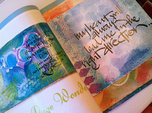 First, here’s my Somerset Studio piece “One Page Wonder” in the “Lively Art of Lettering” section. It colorfully shows my painted and hand lettered homemade journal that celebrates yummy color and a variety of my unconventional calligraphy.