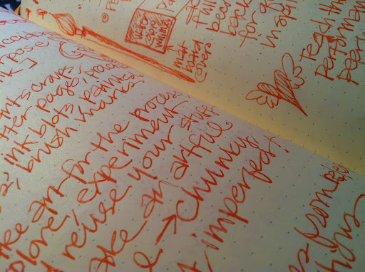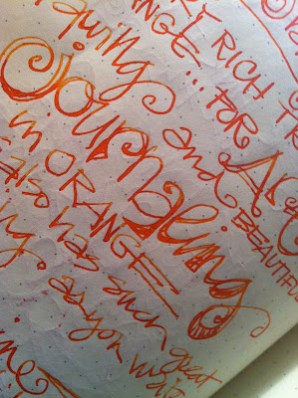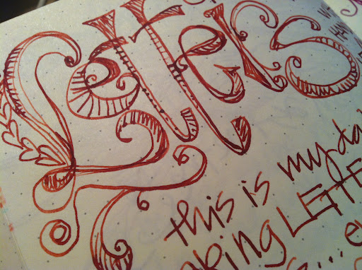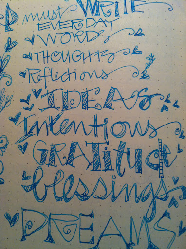 Here’s a peek into one of my lettering, writing, doodling journals. Mine is a Rhodia journal with pages filled with a varitey of ink colors and musings. Try this in your own “pentivity journal” using whatever favorite pens or markers you have. Any journal will do, just have someplace to write and practice every day.